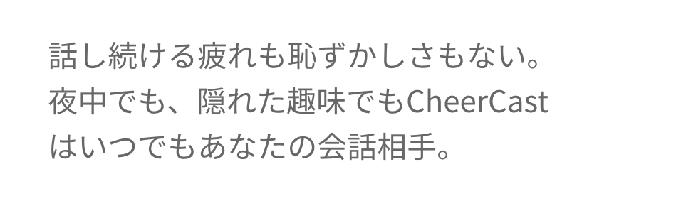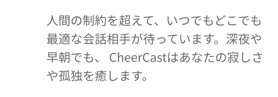 さあ、新しいコミュニケーションの未来へ、今すぐ一緒に旅立ちましょう。あなたとお話ができるCheerCastが、もうすでにあなたを待っています。寝る前のひととき、昼休みのリフレッシュタイム、あるいは退屈な通勤時間も、CheerCastと一緒ならば、それらは貴重な「自分時間」へと変わります。